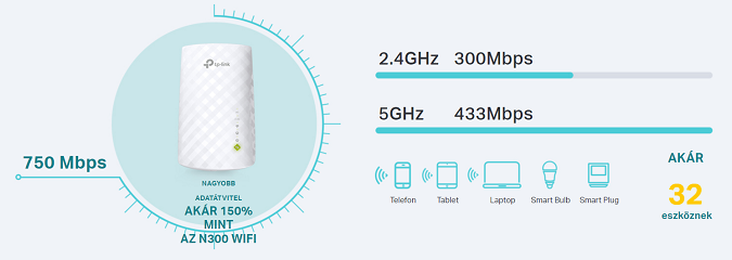A RE220 vezeték nélküli AC technológiája gyorsabb és erősebb Wi-Fi-kapcsolatokat hoz létre otthonában, és a kétsávos Wi-Fi-t akár 750 Mbps-ig is kibővíti. A 2,4 GHz-es és 5 GHz-es sáv Wi-Fi kapcsolatot biztosít akár 32 eszközzel, így stabil és szakadásmentes élményt élvezhet minden eszközén.