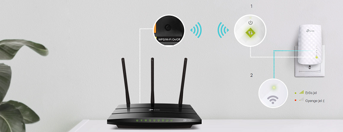 1: Nyomja meg a WPS gombot a routerén majd az RE220 eszközön hogy összekapcsolódjanak. Vagy használja a Tether app-ot ha nincs a meglévő routerén WPS gomb.