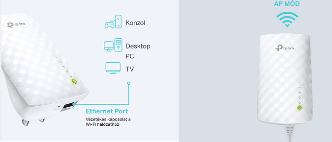 A RE220 Ethernet portja segítségével a vezetékes internetkapcsolat vezeték nélküli hozzáférési ponttá válhat vagy vezeték nélküli adapterként is működhet vezetékes eszközök csatlakoztatásához.