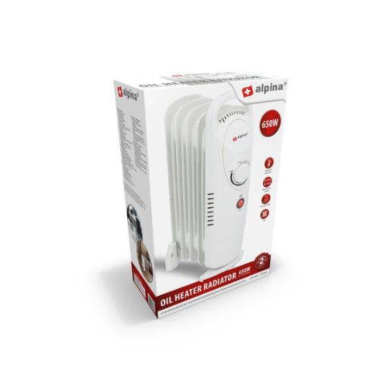 Az Alpina kompakt, 5 tagú olajradiátora ideális kiegészítő fűtés kisebb helyiségekbe, irodákba vagy hálószobákba. Az 650 W teljesítményű készülék halk működéssel biztosítja a kellemes meleget, miközben egyszerűen kezelhető a beépített hőfokszabályzóval. Kis mérete miatt könnyen hordozható és tárolható.