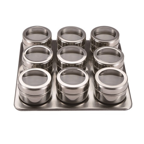 Rozsdamentes acél fűszertartó. 9db üvegcse 6.3x4.3cm méretben és egy tartó.