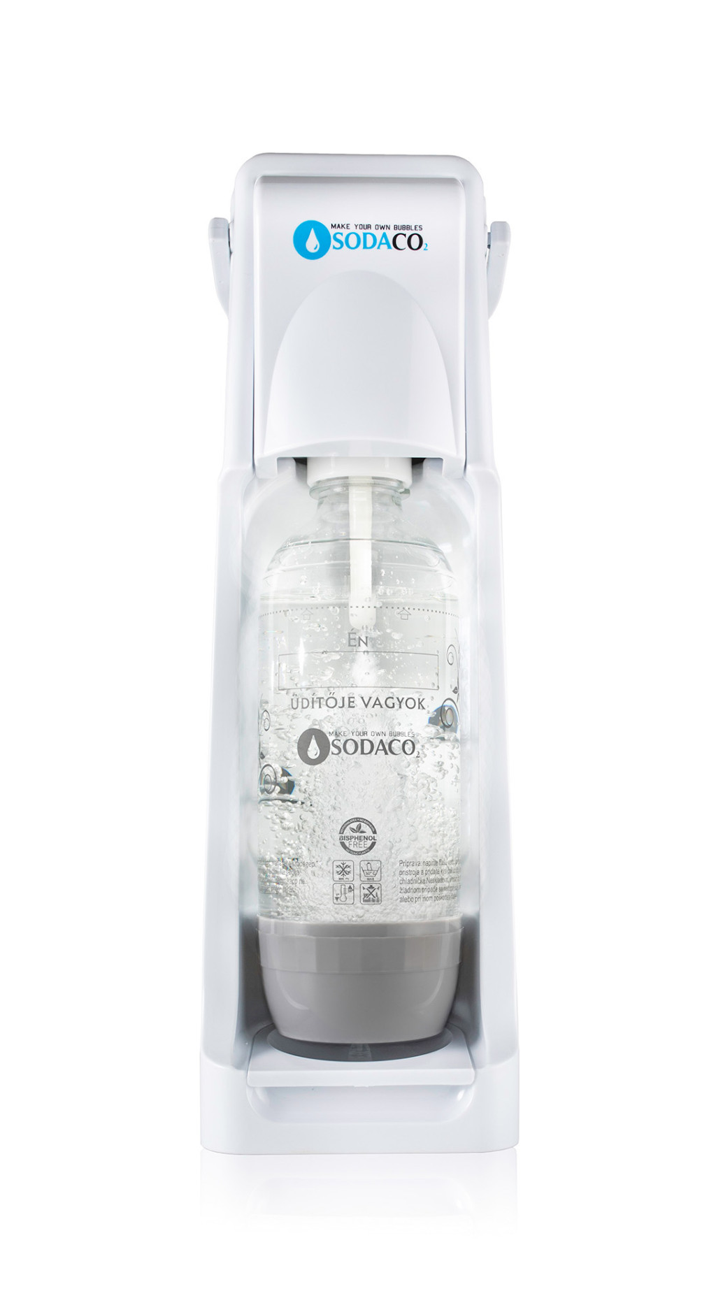 SodaCo B100F Basic Szódakészítő gép, fehér Műanyag, fehér színű háztartási szódakészítő gép. Használatával pillanatok alatt friss, szénsavas vizet készíthetünk. Környezetbarát és takarékos választás, mert nem károsítjuk környezetünket a bolti ásványvizek hazacipeléséből származó sok műanyag hulladékkal. A csomag tartalma egy szódakészítő gép, egy 425 grammos CO2 patron és egy BPA mentes, 1 literes szénsavasító flakon. Egy teli patronnal átlag 60-80 liter szóda készíthető, a szénsavasság mértékétől és a gép típusától függően. Anyaga: műanyag