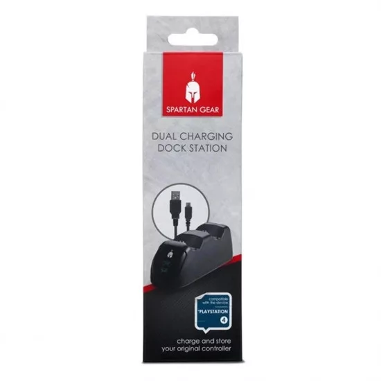 A Spartan Gear - Dual Charging Dock Station (V2) töltődokkolóval akár két hivatalos PlayStation 4 kontrollert is lehet tölteni egyidejűleg. A kontroller USB-portja könnyen csatlakoztatható a dokkolóhoz, míg a kontrollerek teljes feltöltődését egy jelzőfény jelzi.