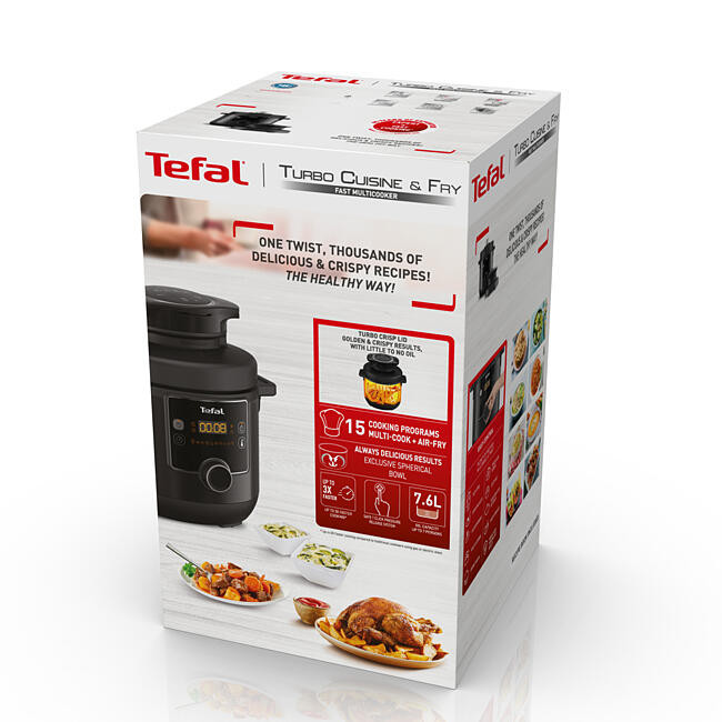 Ismerje meg új, megbízható szövetségesét a tökéletes főzés megkönnyítéséhez: Tefal Turbo Cuisine & Fry! Ez a kivételes légkeveréses, fedéllel felszerelt multifunkciós edény teljes sütő szettet tartalmaz az egészséges és ízletes ételek egy gombnyomással történő elkészítéséhez. Fedezze fel a végtelen inspirációt nyújtó recepteket a könnyű és ropogós chipsektől kezdve, a sült húsokig és még sok más ételig. Használja a Turbo Cuisine-t kuktafazékként, hogy akár 3x gyorsabb* és tökéletes főzési eredményt érjen el - mindezt anélkül, hogy állandóan a főzésre kellene figyelnie.