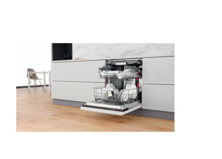 Whirlpool integrált mosogatógép jellemzői: Fekete vezérlőcsík, kiemelkedő B energia minősítés a csökkentett energiafelhasználás érdekében.
